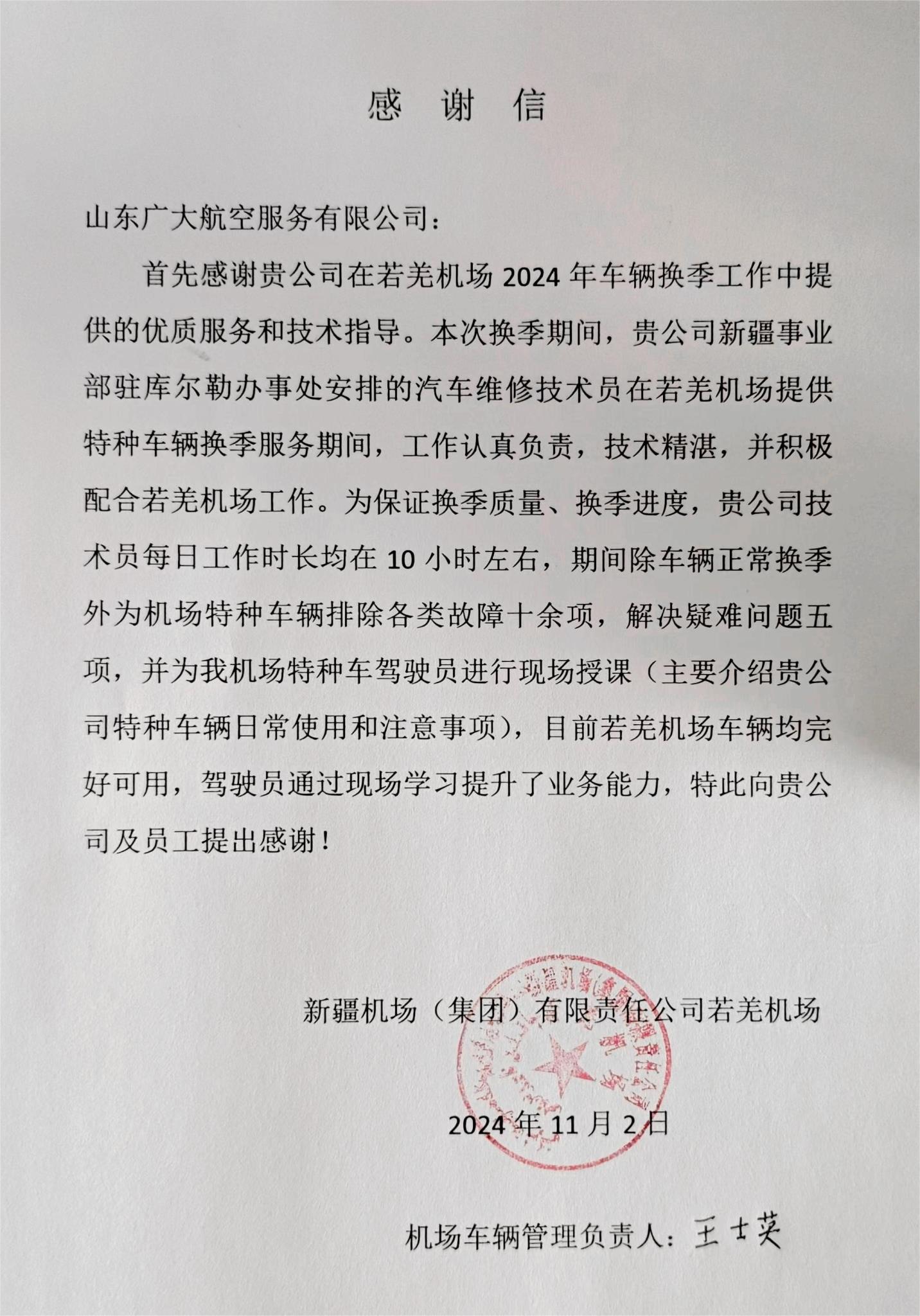 近日,新疆機(jī)場(chǎng)(集團(tuán))有限責(zé)任公司若羌機(jī)場(chǎng)向山東廣大航空服務(wù)有限公司(以下簡(jiǎn)稱(chēng)“廣大航服”)致感謝信,對(duì)其在2024年車(chē)輛換季工作中提供的優(yōu)質(zhì)服務(wù)和技術(shù)指導(dǎo)表示誠(chéng)摯的感謝。若羌機(jī)場(chǎng)在感謝信中提到,廣大航服的汽車(chē)維修技術(shù)員在換季期間表現(xiàn)出色,以專(zhuān)業(yè)技能和敬業(yè)精神為若羌…