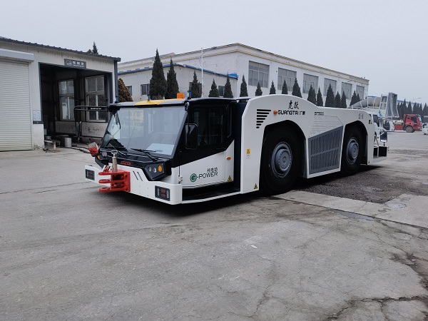 GT50D飛機牽引車(電動式)(規(guī)格號0436B-000)是一種大型電動飛機牽引車。采用磷酸鐵鋰動力電池組,動力系統(tǒng)采用雙電機直驅(qū)車橋的形式,傳動效率高,可實現(xiàn)無極變速,采用電控液壓轉(zhuǎn)向、制動。具有兩輪、四輪、蟹行三種轉(zhuǎn)向模式。產(chǎn)品主要用途是用于維運或拖拉590T以下的客機及貨機?!?