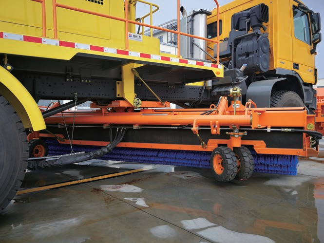 該類設(shè)備是通過向機(jī)場跑道及機(jī)場作業(yè)區(qū)的道面噴灑防(除)冰液,來達(dá)到使機(jī)場道面不結(jié)冰的目的,進(jìn)而保障機(jī)場的正常使用。主要由汽車底盤、液路系統(tǒng)、液壓系統(tǒng)、電氣控制系統(tǒng)、擺臂系統(tǒng)、液罐系統(tǒng)等組成。