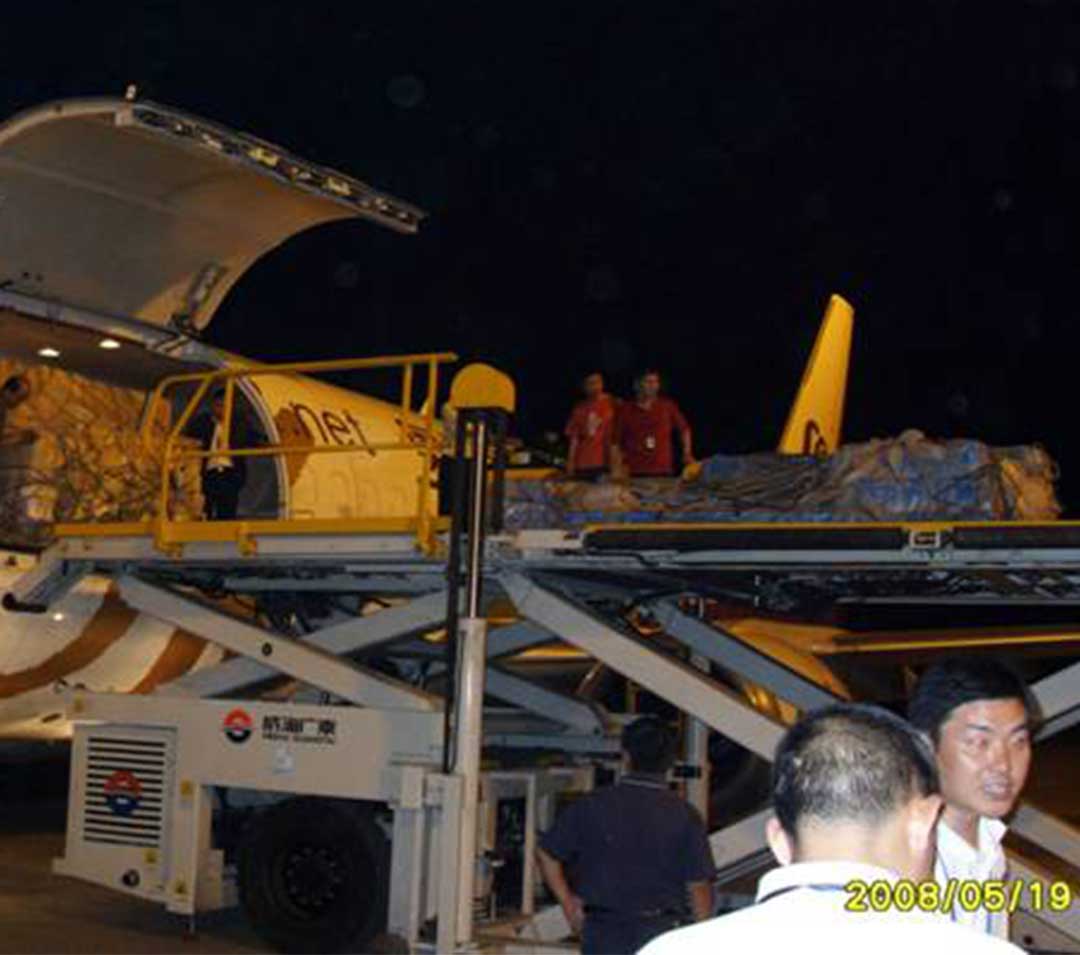 2008年5月16日,汶川地震后公司平臺車在綿陽機(jī)場作業(yè)